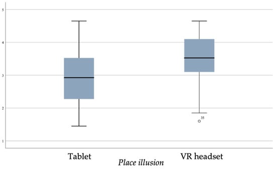 Regarding the sense of place illusion, the t-test results reveal significant differences between the viewing conditions (t (102) = −3.772, p < 0.001), i.e., between the tablet group and the VR headset group. Moreover, the analysis shows that users who watched the 360-degree video with the VR headset report a higher sense of place illusion (M = 3.5, SD = 0.747) than those in the tablet condition (M = 2.93, SD = 0.797), as shown in Figure 1.