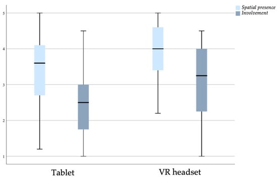 Similar results regarding the subscales were found (see Figure 2). The t-test show the existence of statistically significant differences also between tablet and VR headset groups both in terms of spatial presence (t (102) = −2.843; p < 0.01) and involvement (t (102) = −3.649; p < 0.001). Furthermore, these differences are statistically significant in favor of the VR headset viewing condition, both in terms of the sense of spatial presence (M = 3.92, SD = 0.758) and the level of involvement (M = 3.08, SD = 0.997).