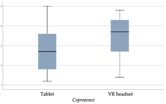 We have used the t-test to check if significant gender differences exist about the sense of co-presence in the whole sample and in the tablet condition. Finally, no significant differences were found. However, to check the same in the VR headset condition, we have used the nonparametric Mann–Whitney U test as the group’s samples are normally distributed (p > 0.05), but the variances are unequal (p < 0.05). In this case, females and males do differ significantly from each other (U = 214.5, p < 0.05) and, in particular, again women (Mdn = 3.8) scored higher than men (Mdn = 2.8).