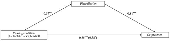 Indirect effect of viewing condition of co-presence. Source: own elaboration. Note: The figures show the unstandardized regression coefficients (B). The arrow relating the viewing condition (X) to the sense of co-presence (Y) includes the regression coefficients for the total effect and, within the brackets, for the direct effect of X on Y. * p < 0.05 and *** p < 0.001.