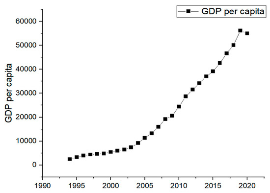 The GDP per capita (GDP), wastewater (WW), waste gas (WG), and SO2 from Henan Province from 1994 to 2020 were selected for analysis, and the secondary data were obtained from the National Bureau of Statistics of China [30]. In order to avoid possible heterovariance and drastic fluctuations in the data and easy to obtain stable series that does not change the characteristics of the time-series data based on the actual data, the various time-series variables were log-normalized, and finally, the new series data were obtained.