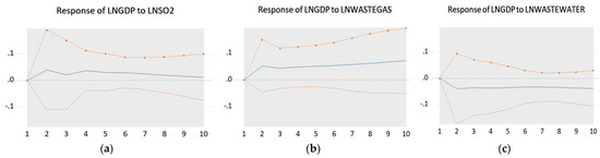 The following impulse response analysis included the three established environmental pollution indicators and economic growth index VAR model. The results are shown in Figure 4.