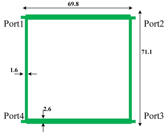 The structure of the typical 0.8 GHz FBLC is shown in Figure 1, which consists of four λ/4 branches. With the applied RT-Duroid 5880 substrate (εr = 2.2 and 20 mil thickness), the size of the typical coupler is 71.1 mm × 69.8 mm. Large occupied size is the first drawback of this coupler.