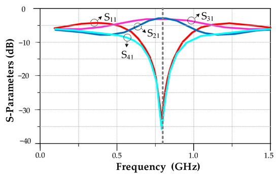 The S-parameters of the typical 0.8 GHz FBLC.