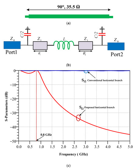 In the conventional coupler, four long branches are used, which occupies large area, so the length reduction of these branches is an important parameter to miniaturize the device [43]. In the proposed FBLC, two types of composite lines are used instead of two long conventional branches. In Figure 4a, the conventional horizontal branch is depicted, which has 90 degrees of length and has 35.5 ohms of impedance. In the proposed coupler, a new horizontal composite branch is proposed as depicted in Figure 4b, which is applied instead of the long conventional branch. These two lines must have the same performance at an operating frequency of 800 MHz. As mentioned, the proposed branches not only reduce the size of the device but also improve the performance of the frequency response. The scattering parameters of the conventional horizontal λ/4 line and the proposed compact horizontal TL are compared in Figure 4c. As seen, both lines have the same insertion loss of 0.05 dB at the 0.8 GHz operating frequency. The proposed horizontal transmission line provides a wide suppression band, while the conventional TL does not provide any harmonics suppression.