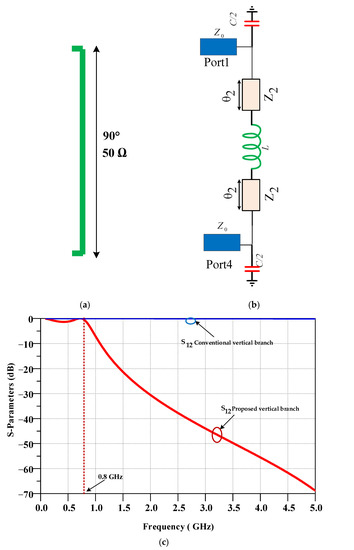 In Figure 5a, the conventional vertical branch is depicted, which has 90 degrees of length and has 50 ohms of impedance. In the proposed coupler, a new vertical composite branch is proposed as depicted in Figure 5b, which is applied instead of the long conventional branch. These two lines must have the same performance at an operating frequency of 800 MHz. The scattering parameters of the conventional vertical λ/4 line and the proposed compact vertical TL are compared in Figure 5c. As seen, both lines have the same values of insertion loss of 0.05 dB at the 0.8 GHz operating frequency. Moreover, the proposed vertical transmission line provides a wide suppression band, while conventional TL cannot provide any harmonics suppression.