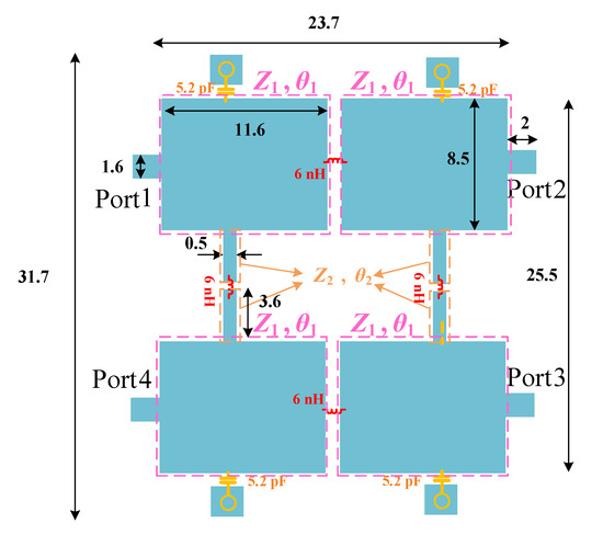 Recently, lumped elements have been used in coupler designs for achieving a miniaturized size or filtering response [39]. Capacitors are used in [40] to create a compact coupler with suppression of harmonics; however, the obtained operating band is very narrow, which may be because of frequency shifting in the fabrication. In addition, varactor diodes can be used in the coupler structure, which can provide tunable and reconfigurable performance of the coupler [41]. Capacitors and inductors are used in the coupler structure designed in [42], but the obtained insertion losses in the output ports are high.