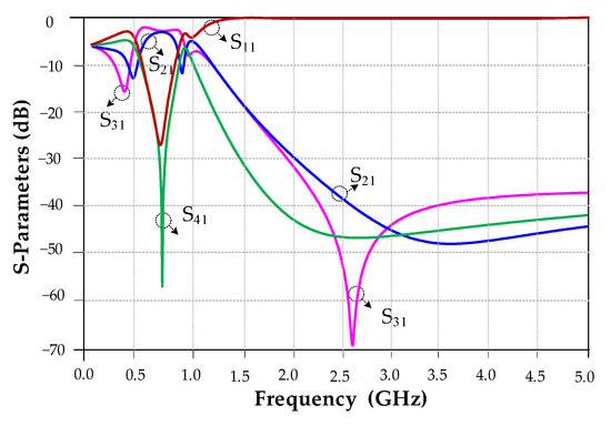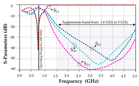 The typical 800 MHz FBLC frequency response is depicted in Figure 2. The amplitudes of S12 and S13 are −3.1 dB and −3.2 dB, which shows less than 0.2 dB insertion loss at operating frequency. The amplitude of S11 is about −32 dB, and the amplitude of S14 is about −36 dB, which shows good performance of the typical coupler at operating frequency. A typical FBLC has good performance at operating frequency, but the performance of this coupler at higher frequency is not acceptable, and undesirable signals are passed, without any suppression at higher frequencies, which is another drawback of the typical FBLC.