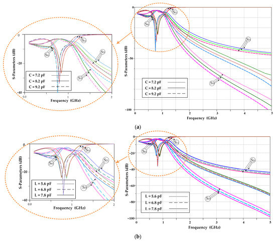 The effects of capacitors and the inductors’ result in the presented LC branches of the designed 0.8 GHz FBLC are shown in Figure 8. As seen, by tuning the values of capacitors and inductors in the presented LC branches, the operating frequency and the operating bandwidth can be adjusted.