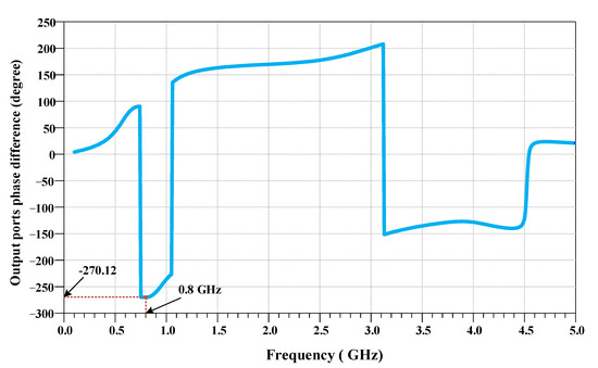 The output ports’ phase difference of the presented FBLC is depicted in Figure 9. As seen, the output ports’ phase difference of the designed coupler is equal to −270.12°, at the operating frequency of 800 MHz, which is so close to the ideal value.
