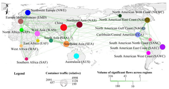 Figure 3 presents significant flow distribution among 19 maritime regions, showing the unevenness of the distribution of significant flows. Inter-regional significant flows account for 35.15% of the total number of significant flows, which is smaller than the number of intra-regional ones to a greater extent. We found that inter-regional significant flows mainly occurred between maritime region pairs that were usually geographically close to each other because ports located close to each other are more likely to connect tightly with each other to a certain degree, such as Europe–Mediterranean and West Asia, North Africa and Europe–Mediterranean, and China and Southeast Asia. The volume of inter-regionally significant flows is relatively large in East Asia; Chinese ports undertake significant flows from Northeast Asia and Southeast Asia, and the flow volume from China to Southeast Asia is also quite significant.