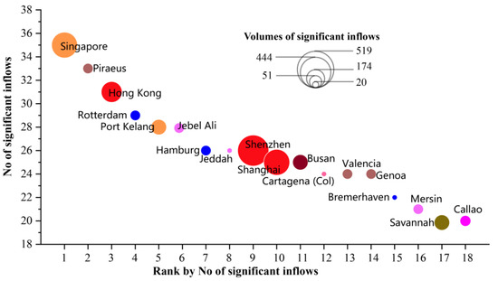 Figure 4 presents the 18 ports that have significant flows greater than or equal to 20. However, a significant number of ports, i.e., 407 ports (accounting for 54.19% of the total), have no more than three significant inflows. Three Chinese container ports are among the top 18 ports by the number of significant inflows, among which Hong Kong ranked third, following Singapore in Southeast Asia and Piraeus in Europe–Mediterranean. Shenzhen and Shanghai are not prominent in the rankings, but regarding the volume of significant flows, Shenzhen ranked first, followed by Shanghai, which has the largest container throughput for 10 consecutive years and comes at the top in terms of both degree centrality (i.e., the number of edges directly connected to the node) and node strength (i.e., the total relative container traffic) in the GLSN. However, other ports (e.g., Piraeus, Jeddah) with a relatively large number of significant flows did not perform well regarding the volume of significant flows. Another example is Ningbo-Zhoushan, which is not displayed in Figure 4 but ranks among the top 5 in terms of significant flow volume, which indicates more control of container traffic from other subordinate ports. Ports that have a higher propensity to communicate with other ports in quality and quantity instead of only aiming at quality may have a relatively high position and function as a hub in the GLSN and, thus, can be more competitive. Chinese ports perform better in terms of volume than in terms of the number of significant connections, possibly because the ports’ functions are mainly as regional gateways, not as transshipment hubs for international liner shipping services [48].