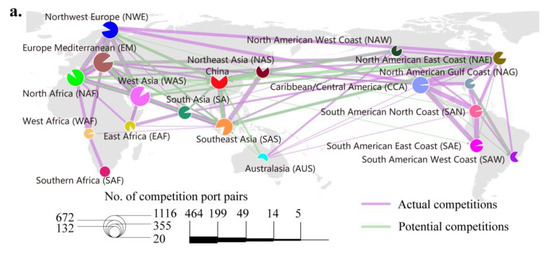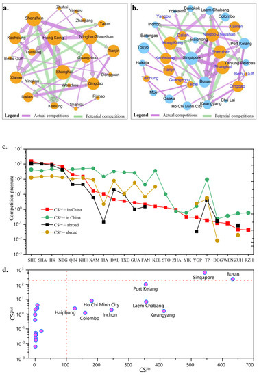 Several Chinese ports are under greater domestic pressure from their potential competitors than from their actual competitors (Figure 6a). For example, the potential pressure Shanghai in the Middle sub-region of China puts on Dalian in the Northeast sub-region is greater than the actual pressure Qingdao, also in the Northeast, puts on Dalian, which indicates not only a challenge in the hub ports structure in each sub-region of China but also a collapse in the barrier between the different sub-regions. The greatest competitive pressure on ports may come not from within the port group but from the main large ports of other port groups. For example, Shenzhen, located in the Pearl River Delta, is the most influential competitor of Ningbo-Zhoushan and Shanghai, both of which are located in the Yangtze River Delta. Shanghai is also the largest competitor of Shenzhen.