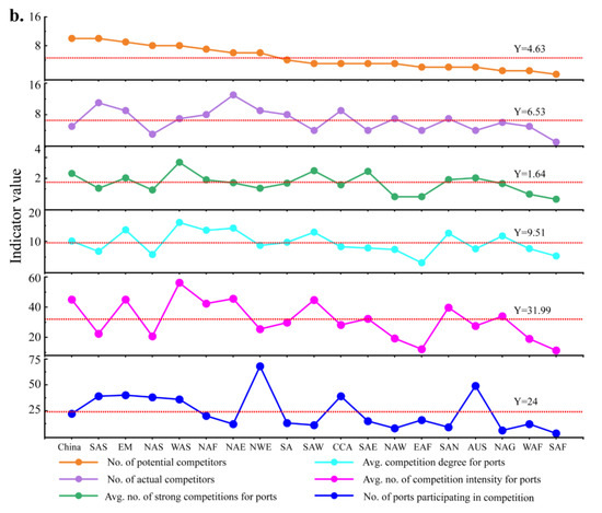 China has few actual competitors (i.e., 5) but many potential competitors (i.e., 10). Southeast Asia and Northeast Asia are the main potential competitors since more competitor port pairs exist between China and these two regions, which indicates more intense competition. For potential competitors, it is interesting that ports in China recognize only ports in Southeast Asia and Northeast Asia as their potential competitors but are considered potential competitors by ports in the other 8 regions, among which Australasia, North American East Coast, North Africa, North American West Coast, and West Asia are not competitors from the perspective of Chinese ports. Figure 7b summarizes the competitive characterizations of different maritime regions for comparison with the overall characteristics of Chinese port competition. Among the 5 indicators describing competition characteristics (i.e., apart from the number of ports participating in the competition, which is certainly related to the total number of ports in each region), 4 indicators of the Chinese container port system are all above the average, which is the case in the other four maritime regions (i.e., West Asia, Europe Mediterranean, North Africa, and South America North Coast). Therefore, the Chinese container port system faces relatively high competition as a whole.