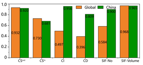 The total container traffic has been used to effectively reflect the position of a port in the GLSN [51]. In this study, the relative total container traffic (Si) is used to replace the real total container traffic, which is feasible, as mentioned above. Therefore, we report the correlation between Si and various competition-related indicators in Figure 8. The volume of significant flow (SIF-Volume) possessed by the port has the closest relationship with Si, with correlation coefficients of more than 96% at both the global port level and the Chinese port level. The pressure released by the port is also significantly related to Si. This shows that large ports would have more control over the significant cargo flows of other ports and tend to put greater pressure on other ports in the shipping network. Moreover, at the global and Chinese port levels, the pressure faced by ports (CS) is moderately related to the total container cargo flow since medium-sized or small ports are pressured by large ports, and vice versa. In terms of the respective correlation coefficients between Si and CI, CD, and SIF-No, significant differences exist between the Chinese port level and the global level; that is, the three correlation coefficients of Chinese container ports are higher than those obtained at the global port level. This may be because Chinese ports’ container traffic volume and SIF-No, which are largely representative of connectivity, CD, and CI are highly relevant, while at the global port level, there are some ports in other maritime regions that have better connectivity but less container traffic volume.