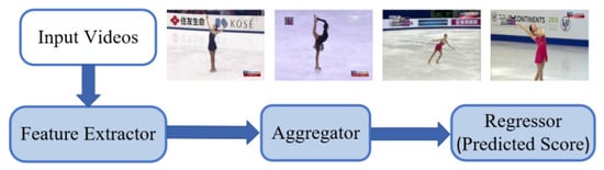 Figure 1 depicts a popular figure skating scoring system that consists primarily of four stages. First, figure skating videos are gathered from sports events. Second, each video is split into several clips, and clip-level features are extracted. Third, an aggregation module is proposed to fuse all clip-level features into video-level features. Finally, a regression model will predict figure skating scores based on video-level features. The second and third stages are the primary focus of this paper.