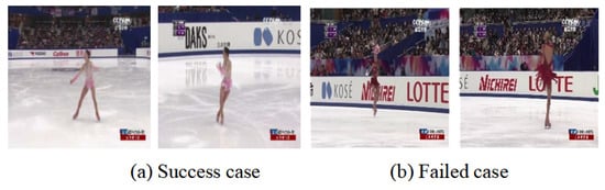 In the aggregation stage, many previous studies [1,3,10,11,12] obtained video-level features by averaging clip-level features, which did not reflect the different importance of the clip. To solve this problem, Xu et al. [13] proposed a deep model that includes two parallel LSTM modules, to efficiently learn the local and global sequential information in each video. To extract more robust stream features, Zeng et al. [4] proposed a context-aware attention module. In this module, the temporal instance-wise graph convolutional network unit is used to explore the relations between instances, and the attention unit is designed to assign a proper weight to each instance. However, these works only focused on dynamic information, which mainly reflects the category of action, while ignoring the location information, which represents the coordinates of specific behavior at a given time. Location information is critical for figure skating scoring, especially in video frames with dark backgrounds. For example, as shown in Figure 2a, video frames with bright backgrounds show the full body of the skaters. Therefore, models can successfully recognize action categories and assess action qualities. However, as shown in Figure 2b, for video frames with dark backgrounds, it is difficult for models to distinguish the body parts apart from the background. The model will be unable to recognize action categories, resulting in the loss of some key clip-level features. Thus, locating the coordinates of athletes is important during the aggregation stage.