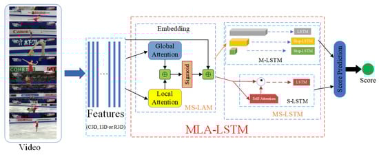 The overall structure diagram of our proposed MLA-LSTM is shown in Figure 3. MS-LSTM mainly includes Self-Attentive LSTM (S-LSTM) and Multi-scale Convolutional Skip LSTM (M-LSTM). The S-LSTM employs a simple self-attentive strategy to select important clip features which are directly used for regression tasks. The M-LSTM models the local and global sequential information at multi-scale, and utilizes the skip LSTM to efficiently save total computational cost. We add MS-LAM to the early feature fusion stage, taking the I3D feature extractor as an example. First, we extract 1024-dimensional clip-level features of the avg-pool layer of I3D pretrain on Kinetics 400 from the whole video. Second, we input the feature sequences into two independent local channel attention and global channel attention. The local channel attention first passes through a 1D point-wise convolution with a convolution kernel size of 1 × 1024 output channel of 128, a batch normalization with 128 features and a ReLU activation function, and then a 1D point-wise convolution with a convolution kernel size of 1 × 128 output channels of 1024 and a batch normalization with a feature number of 1024. The global channel attention is based on the local channel attention, an adaptive average pooling operation with an output size of 1 is added to the front, so that all subsequent input sizes are 1. The global attention and the local attention do broadcasting addition operations and element-wise multiplication with the original feature sequence by sigmoid activation function. After that, the early fusion features are input to the MS-LSTM model for regression prediction score.