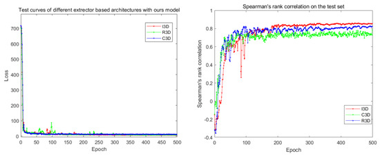 In the multi-scale channel attention module, we set different channels and r for different feature extraction networks; the channels and r of I3D, R3D and C3D are set to 1024, 8; 2048, 16 and 4096, 32 respectively. We build the model by Pytorch and the entire framework is trained on a 1 NVIDIA 1080Ti GPU card, which can achieve 100 epochs of convergence. The specific Loss and Spearman’s rank correlation curves are shown in Figure 5. It takes about 30 min to train a model. Our model is an end-to-end network, so we can directly input the extracted feature sequence into the model for training and predicting scores.