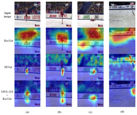 We apply GradCAM [28] to ResNet-50, SENet-50, and MS-LAM-ResNet-50 for the visualization results of images from the Fis-V dataset. Figure 6 shows that the regions recognized by the MS-LAM-ResNet-50 are highly overlapping with the skaters, which indicates that it learns object locations and utilizes features in the regions well. On the contrary, ResNet-50 has poor localization ability and is unable to target in many cases. Although SENet-50 was able to localize some of the location information, the locked region was too large and contained too much background information. This is because SENet-50 only utilizes global channel attention, which is biased toward the global range of contextual information. However, our proposed MS-LAM also aggregates local channel contextual information, which helps the network to identify small targets and character locations in contextually similar situations.