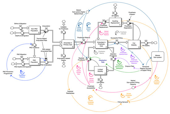 The main limitation of the top-level health care system pertains to modelling individual predispositions or decision points. Specifically, the propensity to dropout from the fitting process or readopt a prosthesis. They remain as simplifications (estimated average fractional rates) that could benefit from further work. Such predispositions are not simply functions of attractiveness, but also dependent on a broad array of individual factors, including mental health state, level of social support, and occurrence of limb pain [69]. In addition, we have excluded individual factors related to quality of life for amputees [70]—which is particularly difficult to operationalize without the involvement of amputees in the model building process. Including groups of amputees, through Group Model Building [71], could be a potent avenue for further research in this field. This could lead to a more robust model boundary that includes individual predispositions as well as quality of life measures.