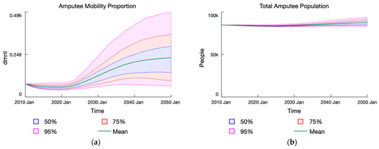 As for the prosthetics accessibility, it increases for the first of half the simulation duration before declining again, which consequently limits the growth of the mobility proportion. With reference to Figure 5, the peak of the mean accessibility is about 44% some time in 2028 (range: 13.6% to 100%), which eventually declines to 20% by 2050 (range: 2.8% to 93.6%). In general, the accessibility ratio increases as the digital market grows and adds additional service capacity to the existing level. In conditions where there is limited market growth, we observe that the accessibility declines around the time when the exogenous funding is cut-off in year 2033. However, under more optimistic market growth conditions, we observe that the accessibility peaks prior to the cut-off time and declines thereafter. This is due to the higher volume of demand for replacing degraded prostheses generated by the Prosthesis Lifecycle loop (R1). Prostheses have a lifecycle of 3 years on average, and hence there is a captive consumer base that will continue to shore up fitting demand—more so when the proportion of fitted amputees is high. As seen in Figure 5, the total accessibility may increase to the maximum (100%) in instances where parameters enable a rapid and large expansion of digital clinics (e.g., Sensitivity of Clinics to Market Size) to meet the demand for fittings. Even then, it declines by the tail end of the simulation for the reasons described.