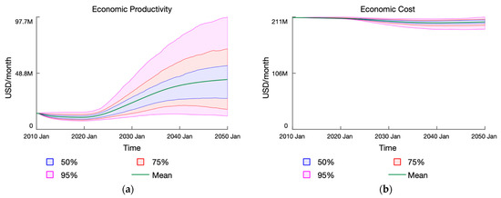 (a) Confidence plot of the undiscounted monthly economic productivity rate in terms of GDP per capita from amputees returning to work; (b) Confidence plot of the undiscounted monthly economic cost incurred for the total amputee population.