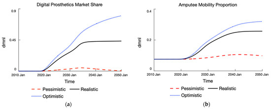 In summary, our simulation model allows exploring the range of mobility outcomes for the amputee population given different market growth conditions for digital prosthetics. We observed in all experimental scenarios that an increase in digital prosthetics market share was associated with improved mobility outcomes. Specifically, there was an increase in the mobility proportion, an increase in total economic productivity, a decrease in total economic costs and an overall positive net benefit from digital prosthetics even under pessimistic conditions. Our model could, thus, serve as a tool for health policy planners to explore a shift in prosthetics service provision to better mitigate the accessibility problem and bolster the social impact of prosthesis usage.