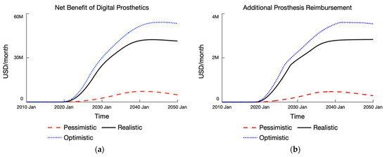 As for the health-related economic indicators, we can now graphically represent the net benefit of digital prosthetics service provision compared to the baseline behavior (Figure 8a). In all three scenarios, the introduction of digital prosthetics results in a positive net benefit. A 0.5% digital market share in 2050 still yields a net benefit of USD5 M per month in the pessimistic scenario. This figure is USD41 M and USD53 M for the realistic and optimistic scenario, respectively. Moreover, we can compare the scale of the net benefit to that of the additional prosthesis reimbursement (Figure 8b). The additional reimbursement is the difference between the total costs for prosthesis services and the baseline costs. In contexts where prosthetics services are covered by national health care systems, digital market growth increases the total costs borne by the state in terms of insurance reimbursements as the volume fittings increases over time. Nevertheless, additional costs incurred in that instance is far outweighed by the net benefit accrued—on average by a factor of 15 across all scenarios.