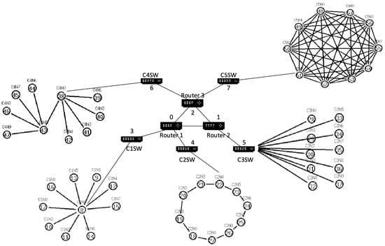 In Figure 1, there exist 3 routers (R1, R2, R3) connected with one another. They are, in turn, connected to the 5 clusters each connected in different topologies, such as star, ring, tree, and mesh.