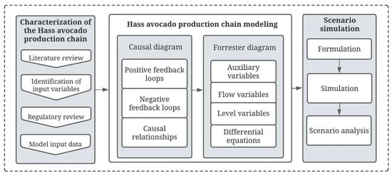 Currently, System Dynamics (SD) models applied to agriculture allow for the comparison of social, economical, productive, and environmental elements, as they adopt a global perspective rather than focusing on minor details [,]. These engineering techniques are ideal for application in the specific scenario of Hass avocado production in the study region, where not only environmental conditions play a fundamental role but also soil and climatic elements, good agricultural practices, and the producer’s economic potential, among other factors [].