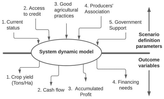 Figure 2 presents a map that demonstrates the identification of problems and solutions, as well as the underlying structure of these problems, according to the cited journal article []. This work aims to evaluate the input parameters in the upper part of the graph, which include the current status, access to credit, adherence to good agricultural practices, producers’ association membership, and government support. The lower part of the graph showcases the variables that can be analyzed through simulation, including crop yield, cash flow, accumulated profit, and financing needs.