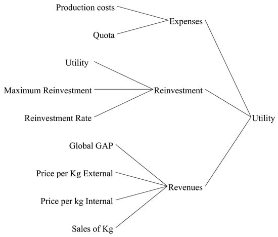 This variable, denoted as “difference between producer’s annual income and expenditure”, is a measure of the profitability of an avocado producer. The sales volume, or quantity of avocados sold, has a direct impact on the producer’s income. Additionally, the price per kilogram of avocados can vary depending on the location of the sale, with domestic sales typically commanding a lower price than international sales. In order to sell avocados abroad, producers must obtain certification from the Colombian Agricultural Institute (ICA) for good agricultural practices. This certification guarantees the quality and safety of the avocados, and is necessary for entry into foreign markets. The price per kilogram of avocados in domestic trade is typically 0.75, while international prices are approximately 1.75 per kilogram. Production costs and the size of payment installments for credit can also affect the producer’s expenditure, and may influence the producer’s decision to reinvest in improvement programs. Figure 4 depicts the variables that impact profit for avocado producers.