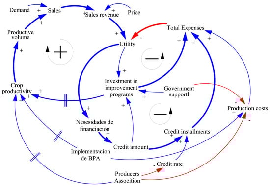 Causal diagrams are graphical representations of variables connected by arrows, indicating causal relationships between the variables []. They allow us to understand the possible routes of association between causes and effects and other alternative routes that may produce biases in the association []. In the context of this research, the low productivity of the agricultural sector has a significant impact on the farmer’s cash flow, as typical scenarios tend to involve more cash outflows than inflows. Thus, the cash flow is affected by the farmer’s income and expenses: demand, sales, and product price per kilogram influence revenues. The product’s price is lower if sold in the domestic market. By applying good agricultural practices, farmers can produce high-quality avocados, which adds value to the product and allows the producer to sell on the international market at a higher price. The farm’s production volume is influenced by the productivity index, which increases as a function of investment in improvement programs, such as implementing irrigation techniques, phytosanitary control, or applying good agricultural practices. Producer association membership also positively impacts productivity and is related to production costs, as association members can achieve cost reductions. In addition, member producers may have easier access to credit with lower interest rates than independent producers. Figure 5 shows the causal relationships between these variables and the positive and negative feedback loops. In this study, a positive feedback loop was identified, represented by the symbol (+) surrounded by a circle with an arrow pointing in the direction of the loop. Two negative feedback loops were also identified, represented by the symbol (-) surrounded by a circle with an arrow pointing to the left to indicate the direction of the loops.