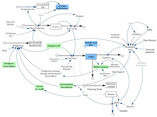 However, minimal empirical evidence is available in avocado production with SD methodology. Aroca’s relevant study in [] concludes agrifood supply chain entails complex relationships. Therefore, understanding actors’ interactions and variables are essential. Aroca’s study presented a dynamic model to simulate structures and interaction links taking into account economic, social, and environmental variables. For these reasons, the lack of production empirical evidence, and the gap with SD simulation, this research applies SD methodology with different avocado production scenarios such as association membership, good agricultural practices, access to credit, and government support. The production yield of each scenario is obtained over 15 years.