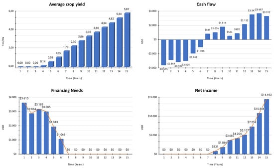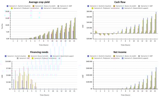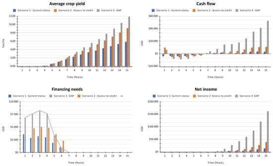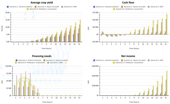 Scenario 1 represents the current performance of the production chain, and Figure 7 shows the indicators used to measure its performance: Average crop yield per year, annual cash flow, annual financing needs, and cumulative net income.