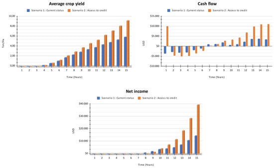 The average annual yield graph reveals that the increase in yield between the current scenario and the scenario with access to credit, with year 15 as a reference, is approximately 50%, going from 5.8 to 8.1 tons per hectare. The cash flow indicates that the outflows in the first few years are higher due to the need to pay credit installments during this period. However, the cumulative net income indicator over the 15-year simulation period shows an increase of 176%, from USD 14,493 to 40,000 per producer. This suggests that producers with access to credit can pay their debt plus interest and achieve higher profits than those without such access. It is also noteworthy that Scenarios 1 and 2 are similar during the first four years of cultivation, indicating that credit support strategies must be durable and flexible to prevent economic bottlenecks in the early years. In addition, the performance improvement is significant from the tenth year onwards, providing significant benefits to producers in these later years.