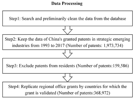 In this study, we construct a new dataset of Chinese SEI patents abroad through data mining and text recognition techniques. First, we use the Relationship Table of Strategic Emerging Industry Classification and International Patent Classification (2021) (Trial) published by CNIPA to obtain the granted SEI patents from the Lens patent database. This database is one of the most comprehensive and authoritative patent databases available and contains over 142.5 million global patent records; it is also an important source of support for many academic researchers [60,61,62]. Second, we search for the patent numbers of some patents with missing country information at the European Patent Office (EPO) or national patent offices to supplement the country information. We also determine the country of origin based on the first applicant [63] and subsequently extract all patent information for those for which the first applicant has a China address. To date, 1973.4 thousand SEI patents by China from 1993 to 2017 were obtained, including 159.6 thousand patents abroad (Figure 1).