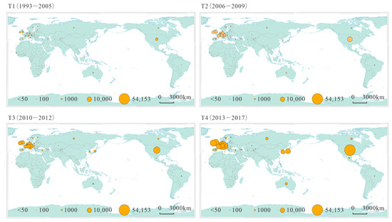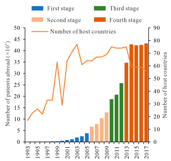 Since the beginning of the 21st century, China has actively integrated into the wave of scientific and technological globalization, and both the number of SEI patents abroad in China and the number of destination countries have increased significantly. In particular, the number of SEI patents abroad is growing exponentially. The development process of Chinese SEI patents abroad from 1993 to 2017 was classified into four stages by the sequential clustering method: 1993–2005, 2006–2009, 2010–2012, and 2013–2017. In the first stage (1993–2005), the number of SEI patents abroad in China was generally low (Figure 2). From 2000 to 2005, China’s 10th Five-Year Plan was in force. During this period, China began to advocate the combination of technology introduction and independent innovation and to prioritize the development of high-tech industries. Under the support and guidance of this policy, the number of Chinese SEI overseas patents increased, and international technological competitiveness improved significantly compared with the early 1990s. During this period, the number of destination countries for China’s SEI patents fluctuated greatly, possibly because China was in the early stage of patents abroad market exploration. The second and third stages were periods of rapid growth in the number of Chinese SEI patents abroad; the average annual growth rate in the second stage was 35.72%. The number of host countries also increased steadily during this period. In the fourth stage (2013–2017), the number of Chinese SEI patents abroad was historically high, but the growth rate slowed. Additionally, the number of destination countries decreased, reflecting the concentration of Chinese patents abroad in a few countries.