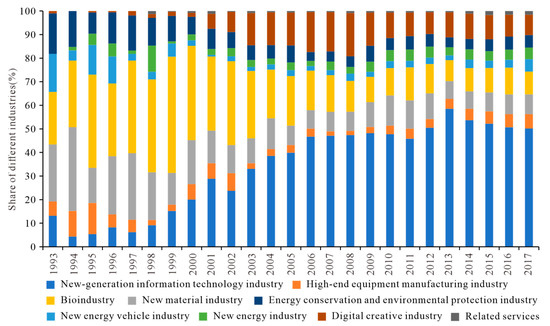 - Prud’homme, D. Dynamics of China’s provincial-level specialization in strategic emerging industries. Res. Policy 2016, 45, 98–115. [Google Scholar] [CrossRef]
