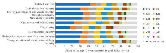 By examining the fourth stage (2013–2017), we found that the geography of the patents abroad host countries of the nine industries had strong similarity (Figure 6). The United States, Western Europe, Japan and South Korea in East Asia were the common main destinations for overseas patents of the nine major industries. There were only minor differences among different industries in the geography of the main host countries of patents abroad. For example, patents abroad in the new material industry and related services industries were hosted mostly by the United States, Japan, and Germany, while the remaining industries were mostly hosted by the United States, the United Kingdom and Germany. Compared with other industries, the number of host countries for Chinese SEI patents abroad in the new material industry, bioindustry, and high-end equipment manufacturing industry was the largest. Chinese patents abroad in the new material industry, bioindustry and high-end equipment manufacturing industry were also distributed in some African countries, such as South Africa and Morocco.