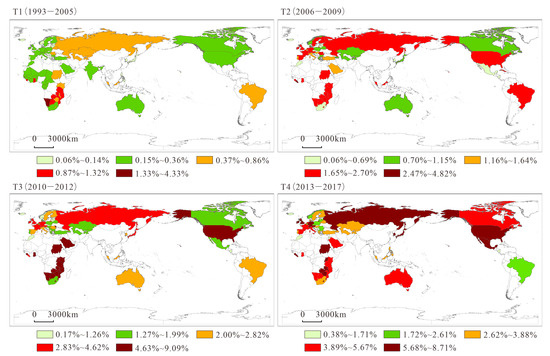 We calculated the ratio of China SEI patents in the host country to the total nonresident SEI patents in the host country to analyze the impact of China’s SEI technology on the host country compared to that of other countries. We used the natural breakpoint method to classify the impact at each stage (Figure 7). From the first stage (1993–2005) to the fourth stage (2013–2017), the influence of Chinese SEI patents abroad increased significantly compared with that of other countries. Geographically and spatially, the influence of Chinese SEI patents abroad is gradually spreading from Africa to traditional technology powerhouses, such as Europe and the United States. In the first stage, Chinese SEI patents abroad accounted for only 0.34%, 0.27%, and 0.12% of nonresident SEI patents in the United States, Germany and Japan, respectively. During the same period, China’s influence in some African countries was relatively high; for example, Chinese SEI patents abroad in Namibia, Tanzania and Botswana accounted for 4.32%, 1.31% and 1.19% of SEI nonresident patents in these countries, respectively. In the fourth stage, the international influence of China SEI patents abroad was significantly enhanced, with the influence being greater in countries such as Russia, the United States and South Korea. Notably, although the international influence of China SEI technologies has been increasing, the proportion of Chinese SEI patents abroad to the total number of SEI nonresident patents in the host country is generally low, at less than 10%. Compared with traditional science and technology powerhouses, such as the United States, Germany, and Japan, there is still a large gap.
