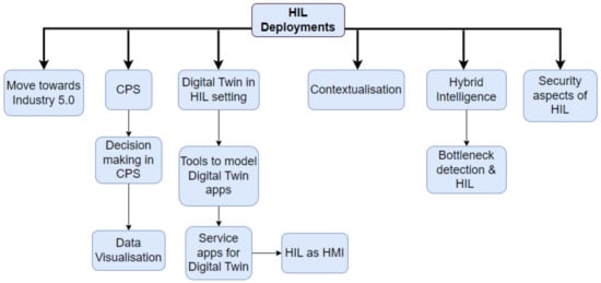The paper is organised as follows. The next section, Section 2, reviews the literature on the existing works carried out on the concept of ‘human-in-loop’ and the roles that human operators can play in a smart manufacturing system. Section 3 addresses the research questions and research methodology. The rest of the paper is structured into the following sections and subsections: Section 4: implications of a move towards Industry 5.0 for HIL performance standards; Section 5: cyber–physical systems; Section 5.1: decision-making in CPS; Section 5.2: data visualisation; Section 6: digital twin technology in an HIL setting; Section 6.2: service applications that support HIL for digital twin; Section 6.1: tools to model and manage digital twin applications; Section 6.3: human-in-loop as human–machine interface; Section 7: contextualisation; Section 8: hybrid intelligence; Section 8.1: bottleneck detection integrating human in loop; Section 9: security aspects of human-in-loop, as given in Figure 1.