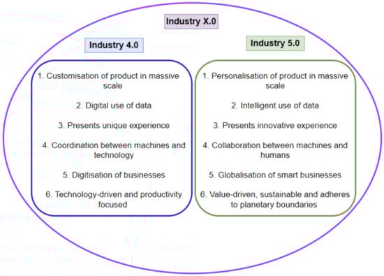 Some of the classification discourse might be described as premature at the present time. While it is clear that the move from I4.0 to I5.0 has already started, the risk of misclassification for certain use cases that invites criticism from the research community is very real. We suggest that case studies where I4.0 technologies are applied to examples where HIL is a necessary component should be described as a hybrid Industry X.0 challenge. The term is introduced by Schaeffer [8]; IX examines important facets of the IIoT, analysing and describing those in an entertaining and approachable way. It is based on in-depth research and insights into the essential competencies identified in industries, which include handling the management of smart data, managing the creation of digital products, educating the workforce, mastering innovation, maximising platforms and ecosystems, and many more. Figure 3 highlights the hybrid IX concept, which is the synergy of I4.0 technologies and I5.0 principles.