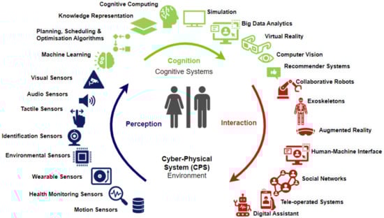 Although AI and ML techniques are being used, human interfaces are necessary, but the level of AI is not yet sufficiently evolved to self-heal or self-diagnose. Along with I4.0, terms such as operator/worker 4.0, etc., are also being coined to differentiate the significance and level of human skills that are required [42], which again poses difficulties for classification. There are many examples of I4.0 use cases where performance would be hindered without some level of HIL. In Figure 4, we have tried to capture this complexity by summarising the various influences that automation and interaction technologies can have on human cognition.