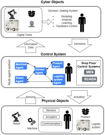 - Control layer is the layer between physical and cyber layers which reproduces the functioning of every physical object. The holonic and multi-agent control approach presented is compatible with industrial control systems (e.g., SCADA), which, with proper integration, provide control over the manufacturing process [52].The control layer’s key attributes that are presented in the above work can be classified as: