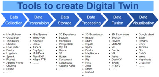 The enterprise tools that are now appearing for DT applications can be broadly divided into the platform, simulation, optimisation, diagnostic, and prognosis categories. Across these categories, data quality is the primary driver behind DT fidelity. As displayed in Figure 8, the various categories, namely collection, transmission, storage, processing, fusion, and visualisation, are the tools for managing data in a DT.