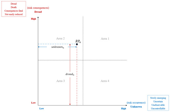 Figure 2, from left to right, indicates a gradual increase in the perception of unknown; from bottom to top, it indicates a gradual increase in the perception of dread. Among them, the perception of unknown and dread is the largest in Area 1, and the perception of unknown and dread is the smallest in Area 3. then indicates the risk perception value on day t, which is calculated as follows.
