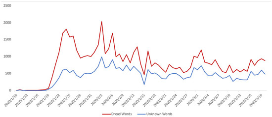 Table 3 shows the results of the statistical calculations. During our sample period (71 days in total), there were 800 posts expressing dread words on average per day, while there were 435 posts expressing unknown words on average per day. This shows that people were more inclined to express a dread mindset in post content, while expressions of uncertainty numbered only half of the dread expressions.