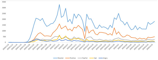 We calculated the emotion classification results from the emotion classification model, and further calculated the distribution of each of the five emotion categories. As shown in Figure 5, except for “neutral,” there were significantly more positive than negative emotions (fearful, sad, and angry) in posts.